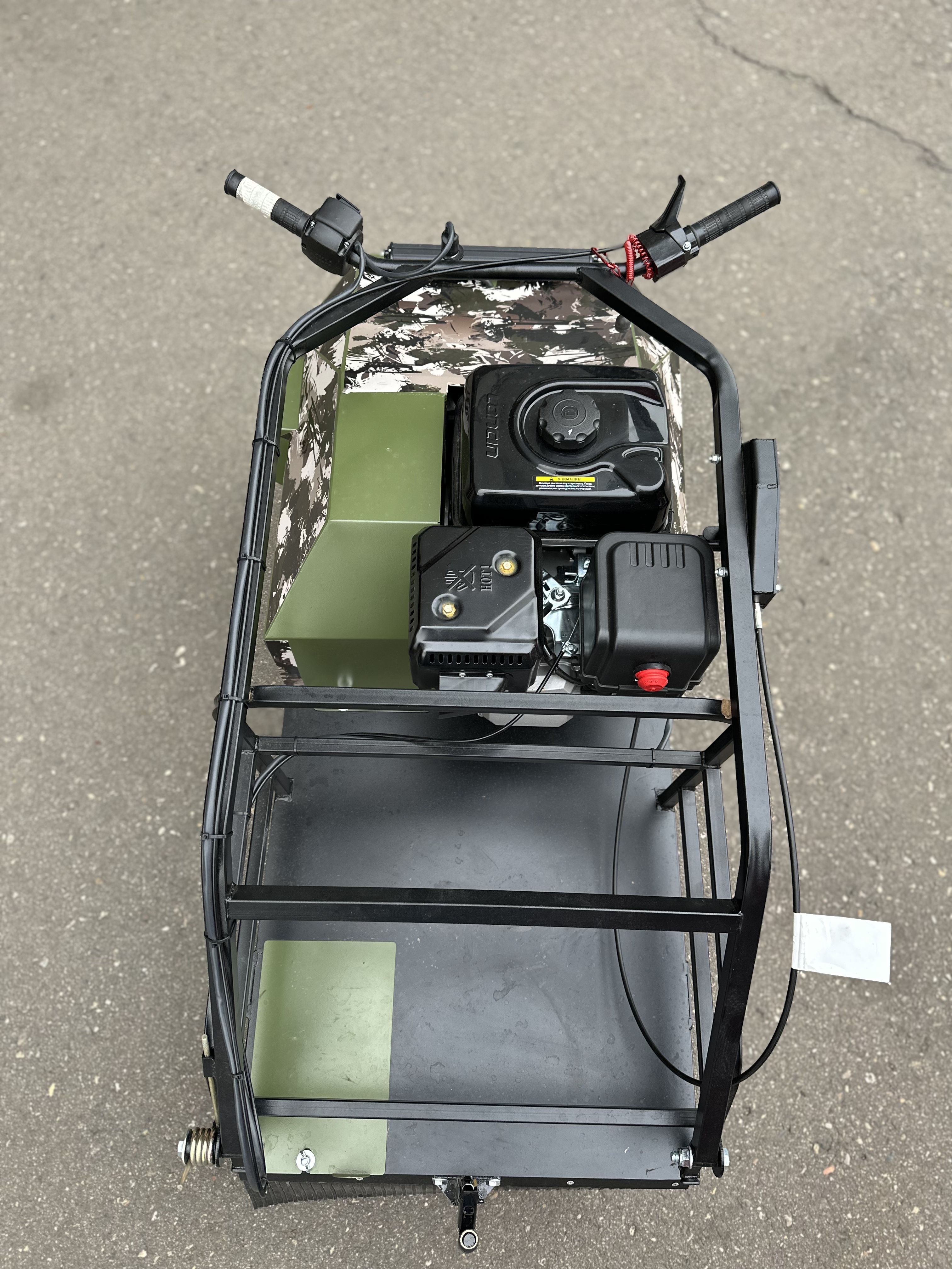 В комплектацию мотобуксировщика входят: эластичные и термостойкие резиновые ободы катков для дополнительной амортизации, ящик для хранения полезных мелочей, пружина-фиксатор руля, ручка-бампер для удобной транспортировки и отсекатель снега, который защищает двигатель от попадания снега.