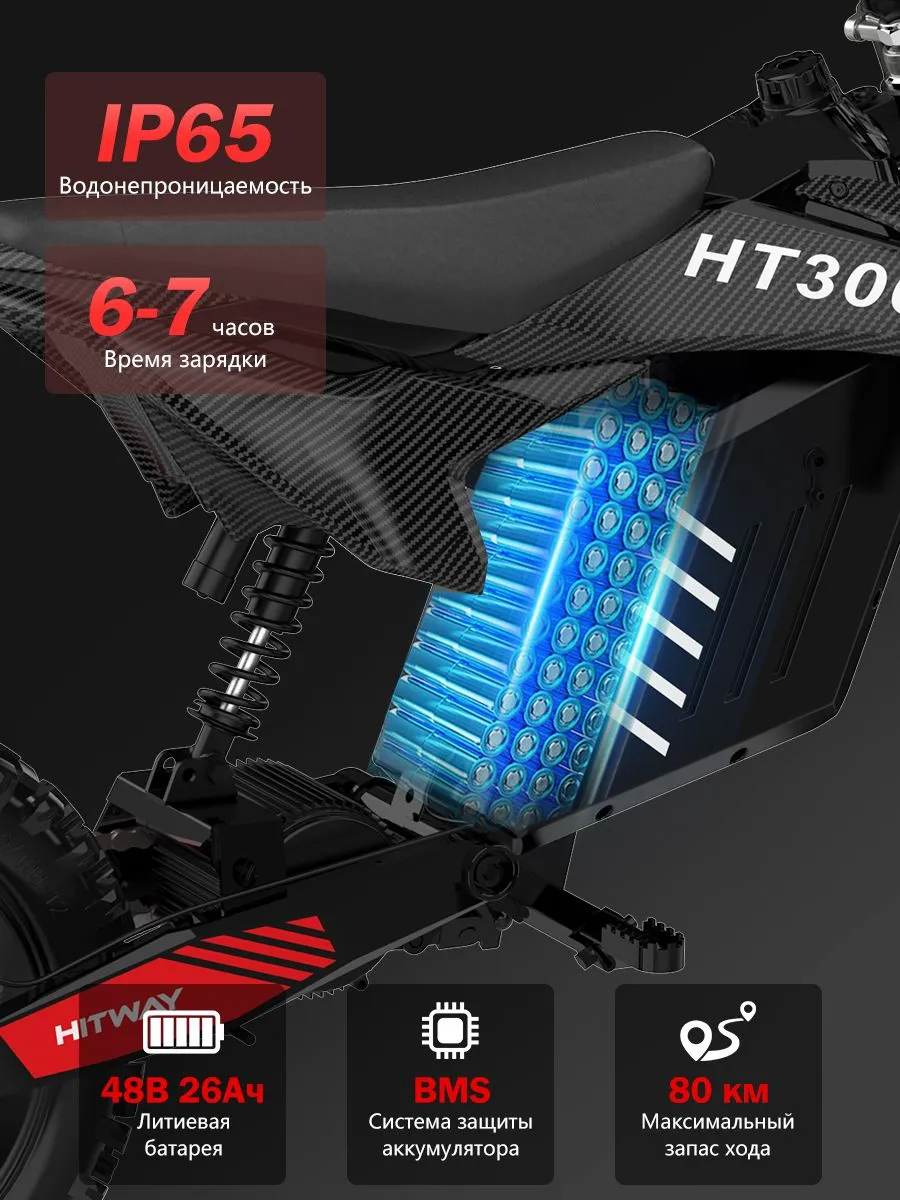 Максимальная скорость 50 км/ч является безопасным и комфортным пределом для внедорожной езды. Влагозащита IP65 позволяет не беспокоиться о состоянии электроники при движении в сырую погоду. HITWAY HT300 сочетает мощность, проходимость и надежность для активного отдыха на природе.