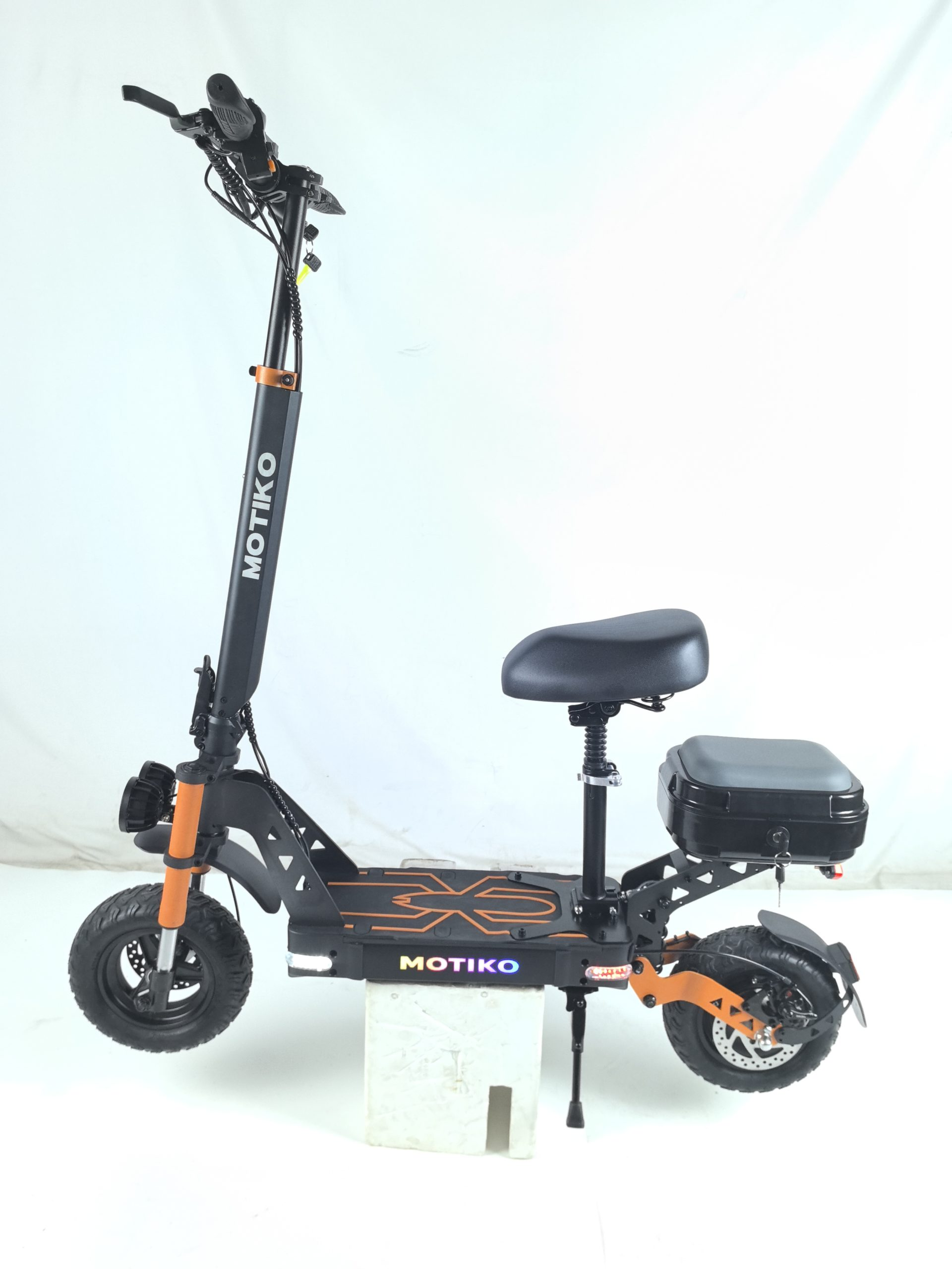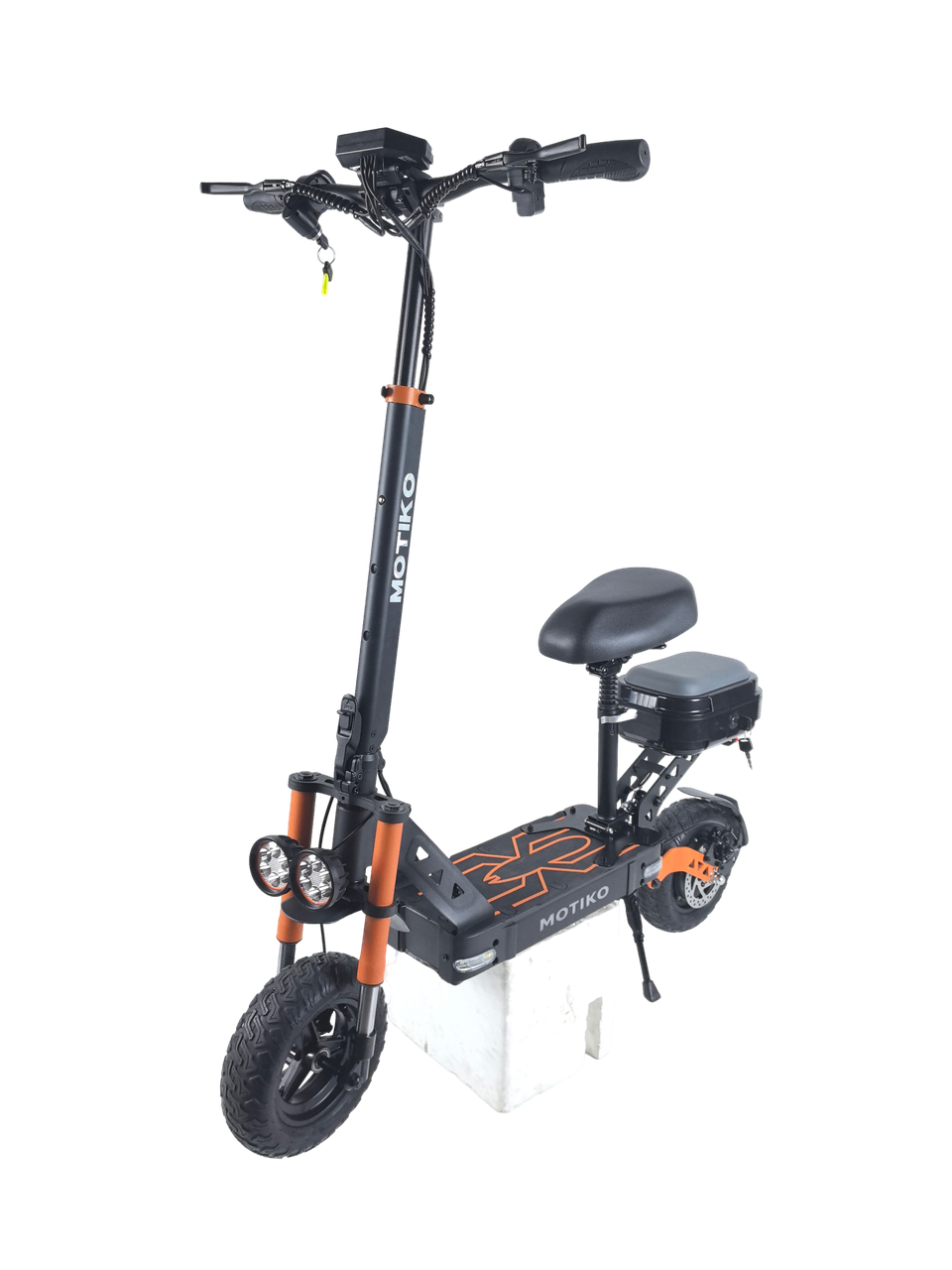 MOTIKO G1 оборудован дисковыми тормозами на переднем и заднем колёсах, что гарантирует надёжное и предсказуемое торможение в любую погоду. Дисковые тормоза меньше страдают от грязи, пыли и воды, поэтому они сохраняют эффективность даже при езде по мокрому асфальту или в небольшой дождь. Такая система позволяет быстро остановиться в экстренной ситуации и сокращает тормозной путь, что особенно важно в плотном городском трафике. Вы можете быть уверены: самокат послушно замедлится именно тогда, когда это нужно.