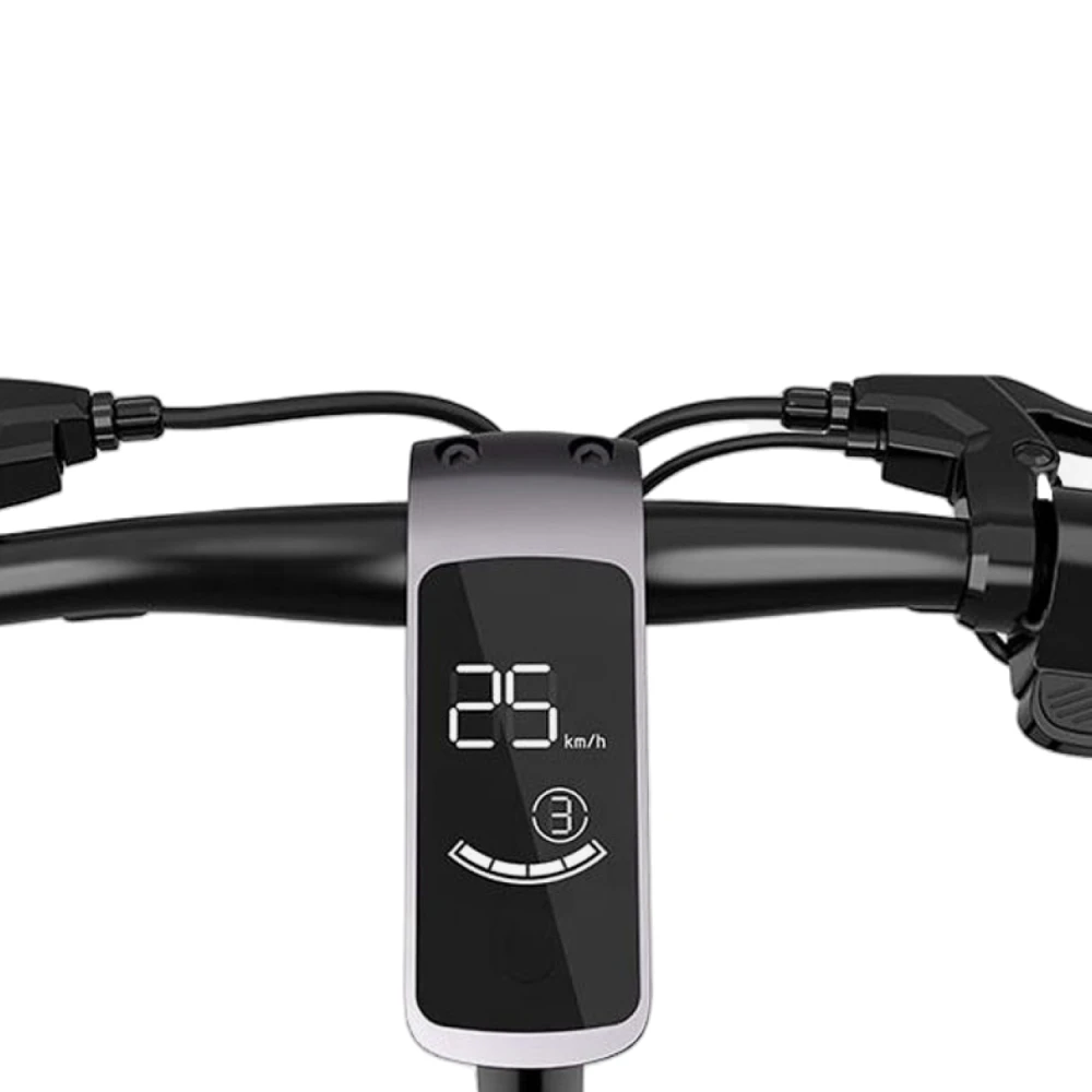 Передний амортизатор значительно улучшает комфорт, поглощая удары и вибрации при движении по неровным поверхностям. Многофункциональный цветной дисплей позволяет удобно отслеживать скорость, уровень заряда аккумулятора и другие важные параметры, что делает управление самокатом более простым и информативным.