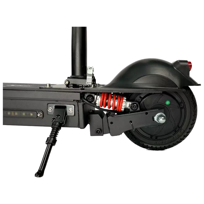 Модель оснащена передними и задними амортизаторами, что значительно повышает комфорт во время поездок. Большая дека с резиновым основанием обеспечивает надежное сцепление и комфортную посадку, даже при длительных поездках.