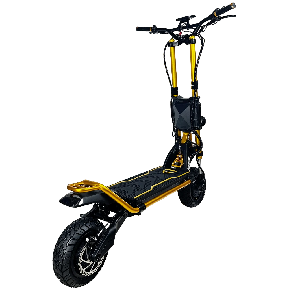 Но эта мощь — управляемая и умная. Благодаря полному приводу, эта энергия передаётся на дорогу максимально эффективно. На сухом асфальте — это рекордное ускорение. На мокрой дороге или грунте — это уверенное и безопасное сцепление, без пробуксовок. Вы управляете не просто самокатом, вы управляете потоком чистой энергии, который послушно направляется туда, куда нужно вам. Максимальная скорость в 105 км/ч — это не предел, а комфортный крейсерский режим, на котором аппарат чувствует себя устойчиво и собранно, благодаря массе в 67 кг и продуманной геометрии.