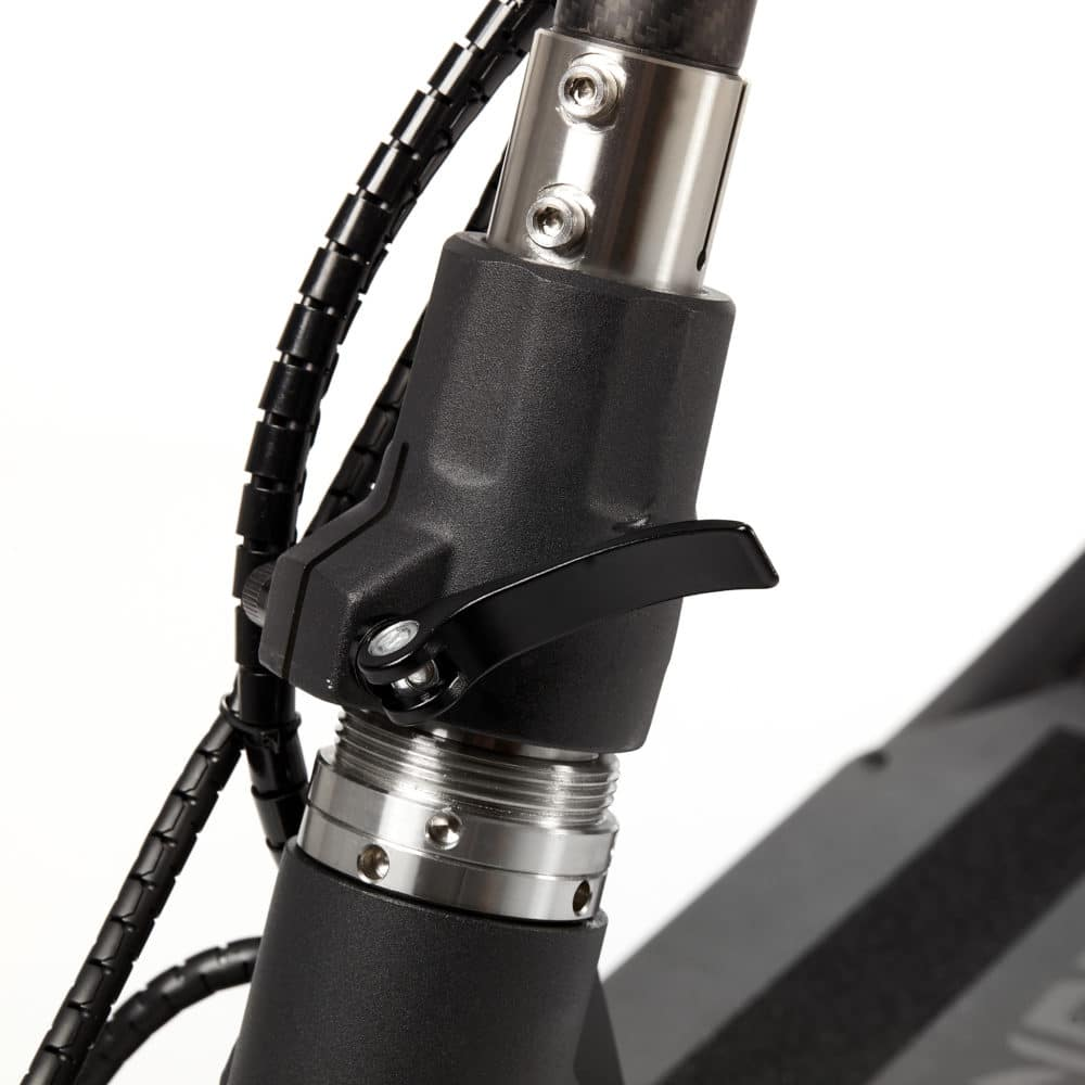 Электросамокат имеет складную стойку, что позволяет удобно хранить и транспортировать его. Складная колонка руля обеспечивает возможность регулировки по высоте, что позволяет адаптировать самокат под рост пользователя.