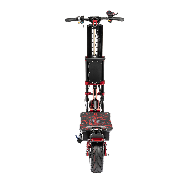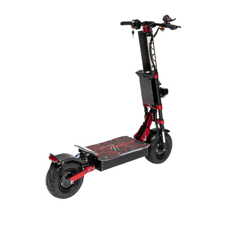 Yokamura Raptor 13-X как и его собрат занимает одну из лидирующий позиций по скорости, которая достигает отметки в 80км/ч. Самокат оборудован гидравлической мотовилкой, амортизатором заднего колеса, имеет 13-и дюймовых мотор-колеса по 2500w каждое. Raptor отлично показывает себя как на бездорожье так и на асфальте. Моневненность, не смотря на размеры самоката удивляет. Удобство перемещения на дальнии дистанции обеспечивает мягкое сидение которое с легкостью можно установить на деку самоката.