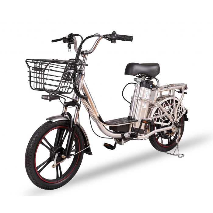 Недорогой электровелосипед Minako Z1 – городской транспорт, подходящий для перевозки грузов в к установленной на руле багажной корзине.