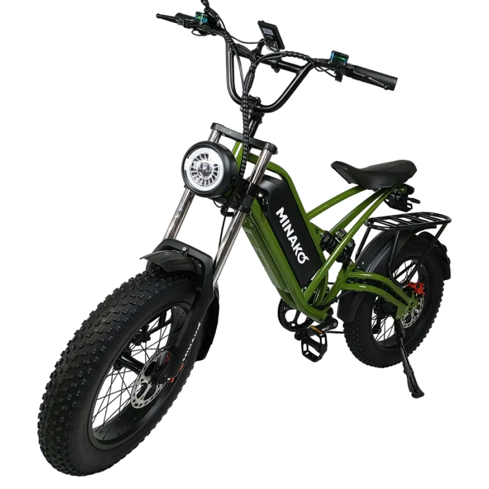 Широкие колеса и качественные шины обеспечивают отличное сцепление и устойчивость на различных покрытиях, что делает Minako FOX универсальным для городских и загородных поездок. Этот электрофэтбайк – отличный выбор для тех, кто ценит стиль, комфорт и производительность