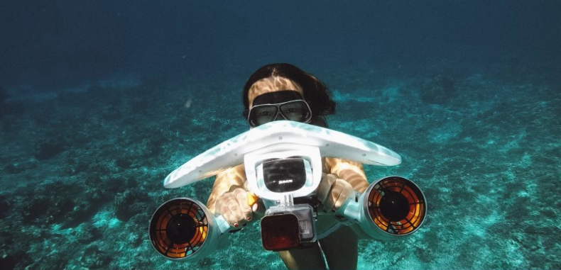 Нажмите и удерживайте кнопки по бокам для старта, отпустите любую для остановки. Скутер легко вращается на 360° под водой.